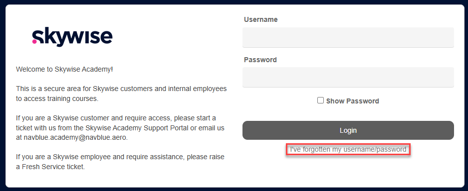 If you have forgotten your password for Skywise Academy, you can self-service a password reset by following the instructions below.