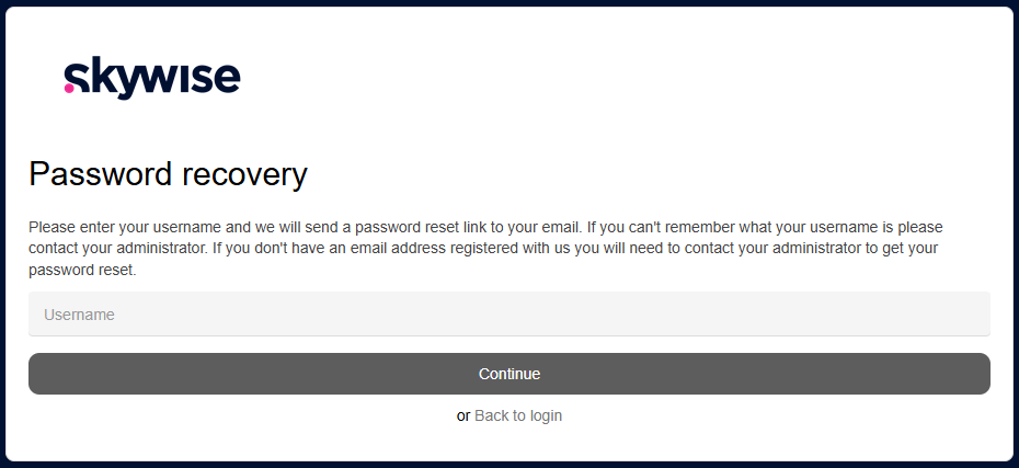 - Enter your email address/username that you registered with. If you cannot remember your email address, you will need to raise a ticket with us from the Skywise Academy support portal.